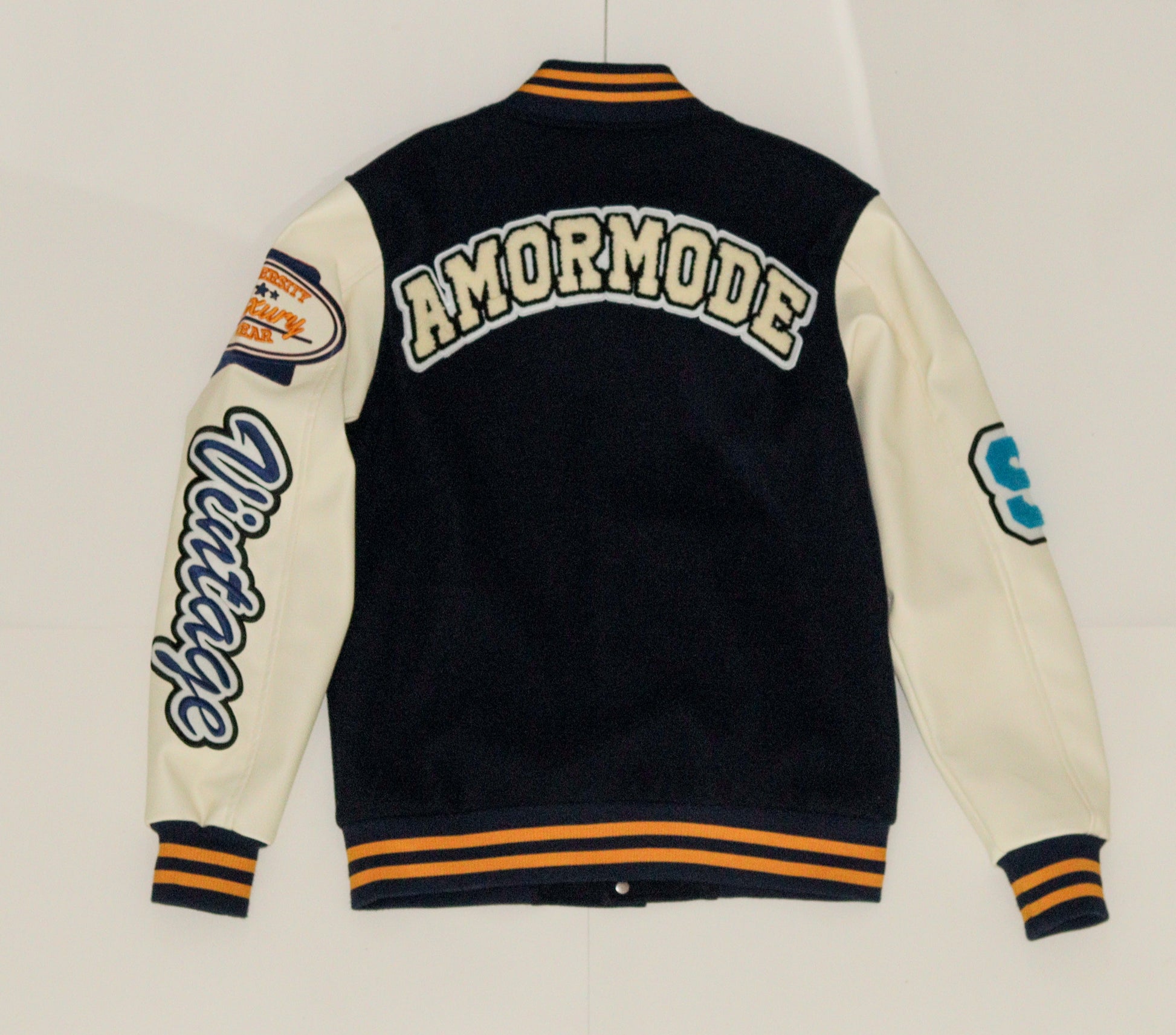 - On the back "AMORMODE" is stitched in large block letters across the upper section.